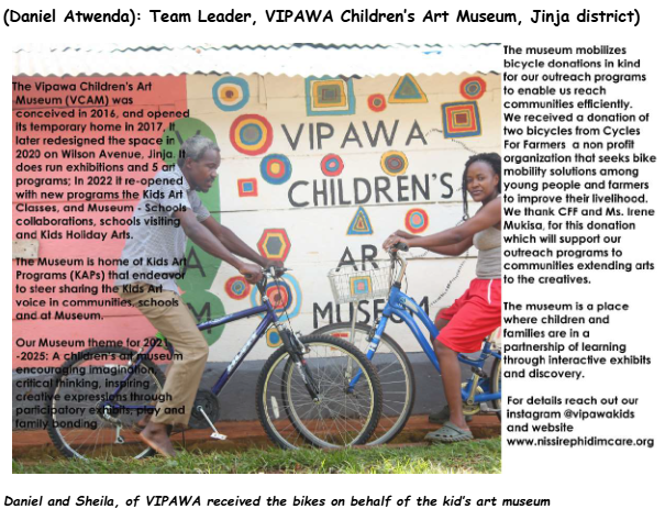 Based in Uganda, Cycles For Farmers (CFF) is a non profit social enterprise that seeks bicycle mobility solutions among smallholder farmers and young people (youth) that are particularly involved in farming, trade, education and community activities, in doing so, we offer transport solutions and improve livelihoods.This is being realized through a partnership with our partner Working Bikes and other supporters who support our cause and donate bicycles to foster our programs.